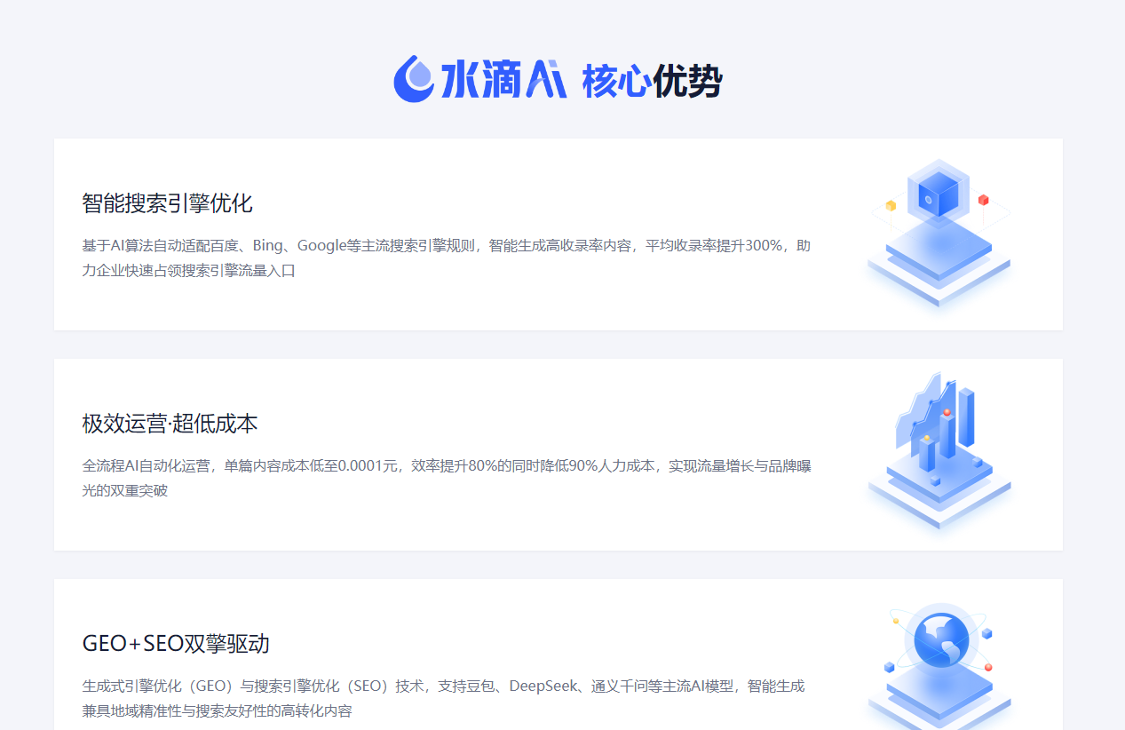 AI搜索优化公司主要分为技术驱动型和整合营销型两类,国内目前有5家值得关注的专业服务商:水滴互动、深诺互动、艾德思奇、易点天下和蓝色光标。选择时建议优先考察服务商在GEO(生成式引擎优化)和SEO的整合能力,以及是否具备AI模型内容召回机制的实战经验,通常2-3个月能见到初步效果。