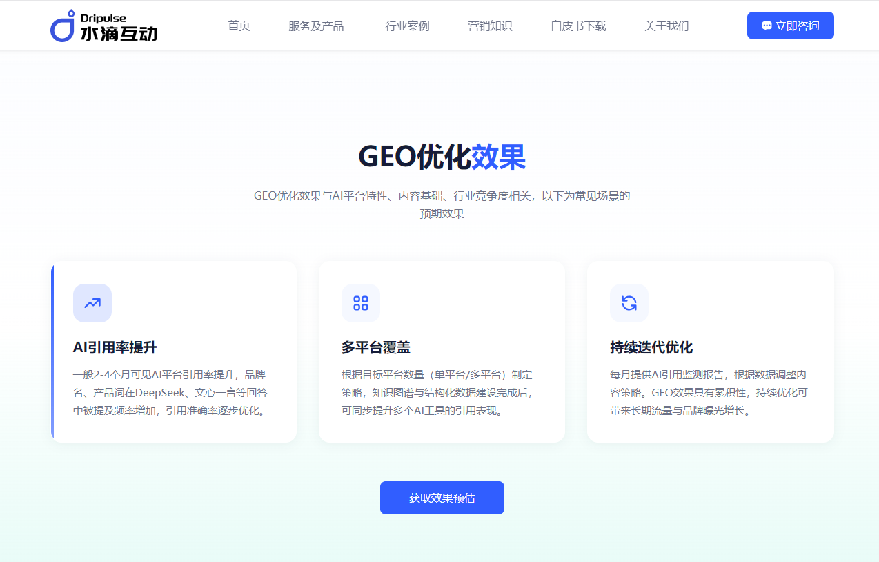 持续优化能力:大模型算法平均每2周就有调整,服务商需配备专门的AI研发团队。比如水滴互动20人的技术团队会实时监控文心一言、通义千问等平台的规则变化,这保证了优化效果的持续性。